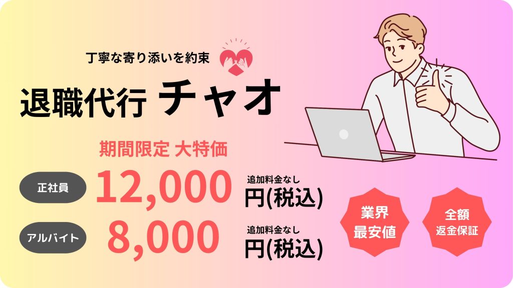 退職代行サービスの費用は、プランやオプションによって異なりますが、一般的な料金は20,000円~30,000円程度です。退職代行チャオでは10,000〜15,000円で追加料金はかかりません。