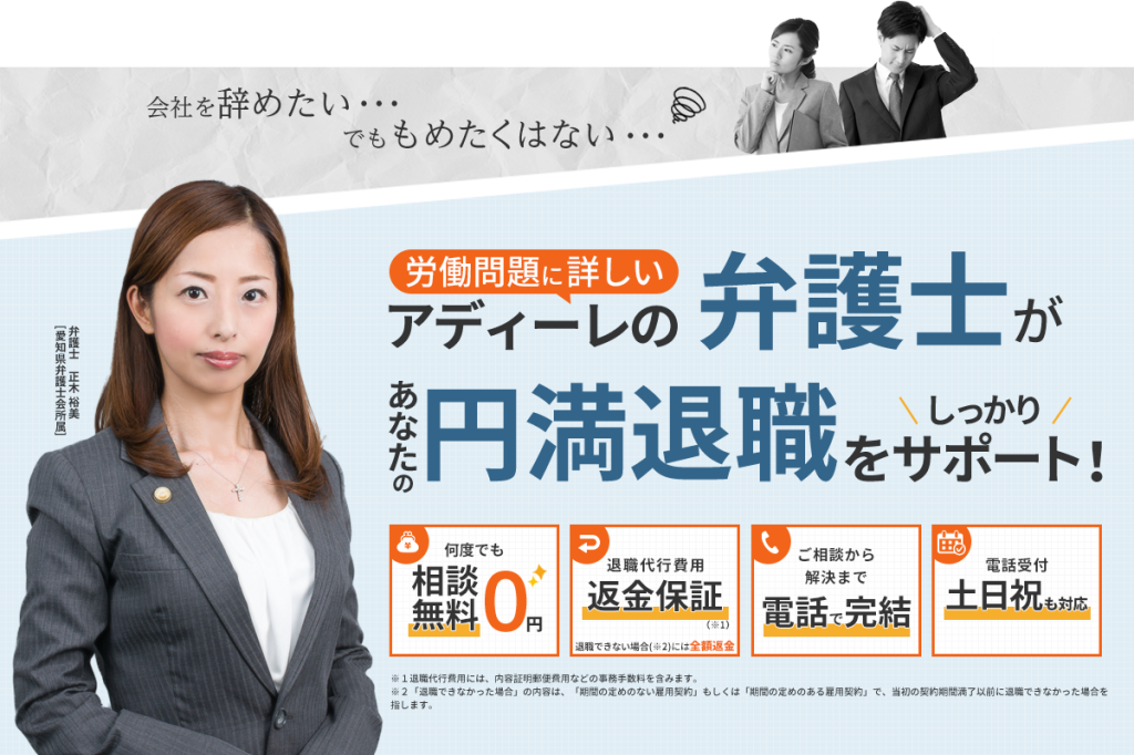 費用は高くなりますが、法的トラブルに巻き込まれることなくスムーズに退職したい方には、大手の法律事務所であるアディーレ法律事務所がおすすめです。労働や事故トラブルなどの相談者数は90万人を超え、全国に65拠点以上を構える実績が多い会社なので、安心して退職代行をお願いすることができます。