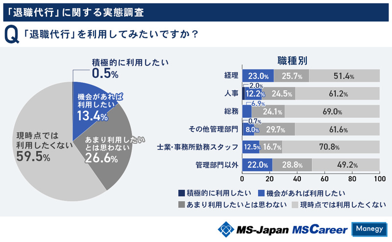 一方で、退職代行サービスを機会があれば利用したいと回答した方は、13.4% であり、今後、利用拡大が期待されています。