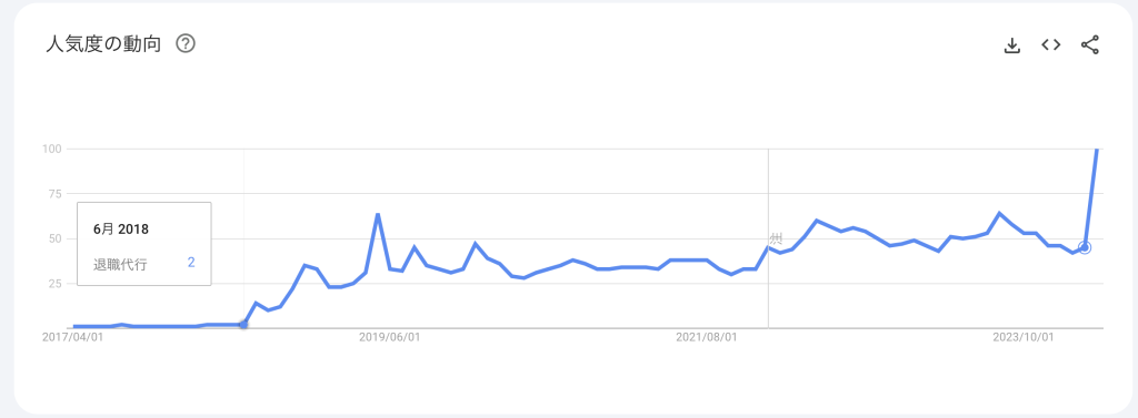 Googleで「退職代行」と検索されている検索件数は、2018年ごろから増えており、2024年では、さらに注目を集めています。